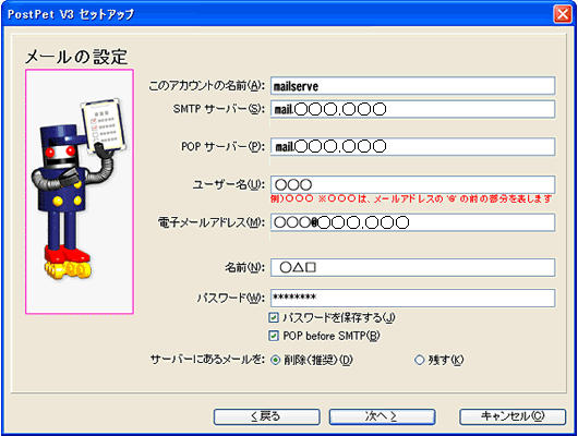 メールソフトの設定方法:PostPet V3 (Win版)